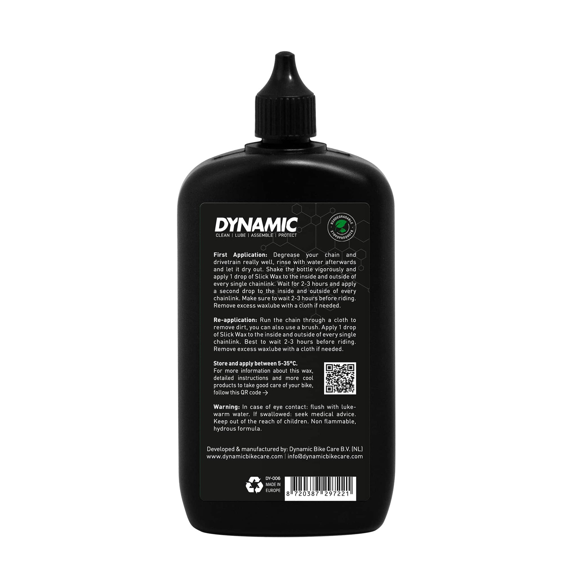 First application: Clean your chain and drivetrain really well, rinse with water afterwards to make sure there is no residue of the chain cleaner left. Let the chain, cassette and crankset dry out completely. Shake the bottle vigorously and apply 1 drop of Slick Wax on the inside and outside of every single chain link. Wait for 2-3 hours and apply a second drop to the inside and outside of every single chain link. Make sure to wait 2-3 hours before riding to get the best result. Remove excess wax with a brush or cloth if needed.
